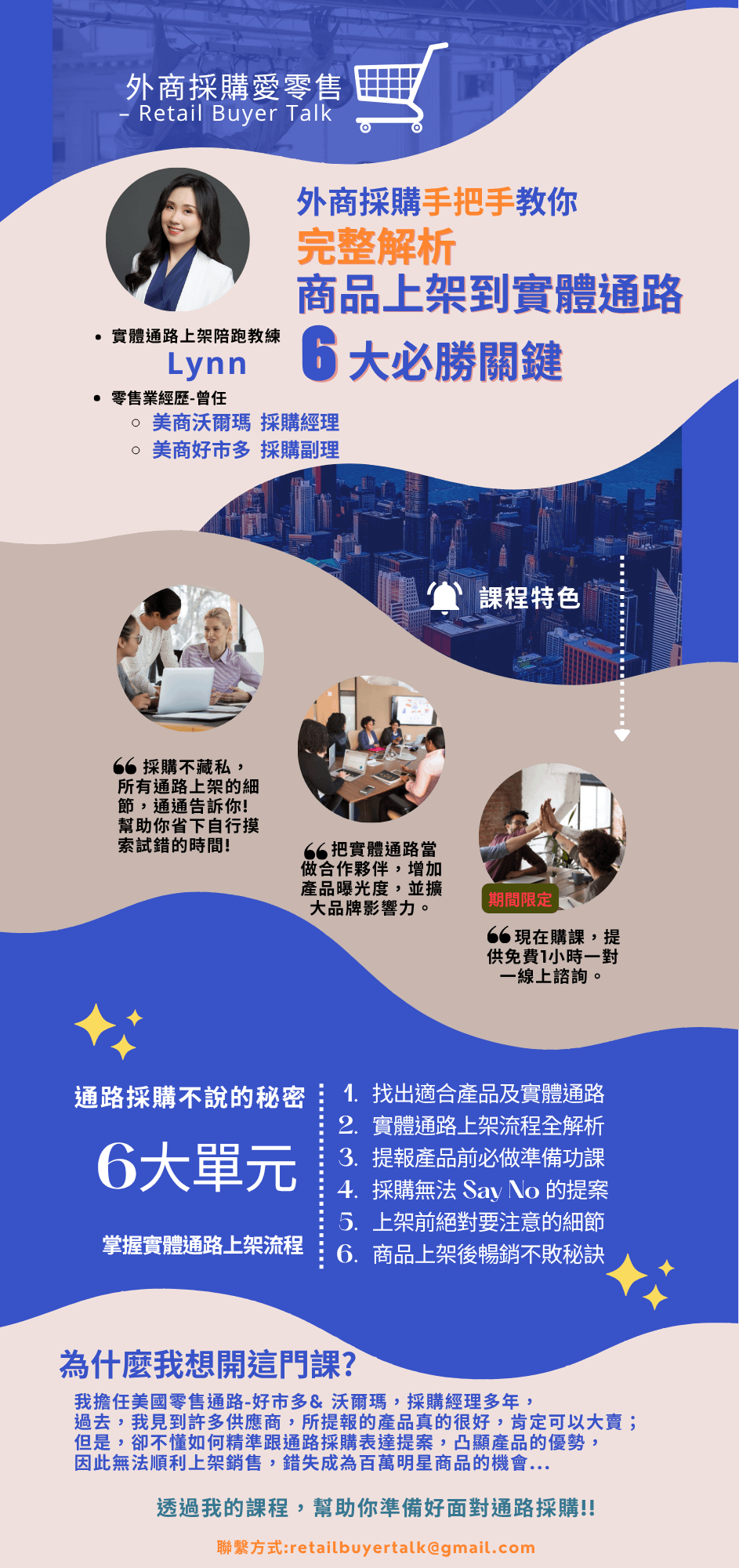 過去曾在美式賣場擔任商品採購的工作,通路採購最重要的工作之一,就是找到有潛力,會熱賣的商品,跟供應商一起克服種種困難,把好商品上架到實體通路,創造業績!